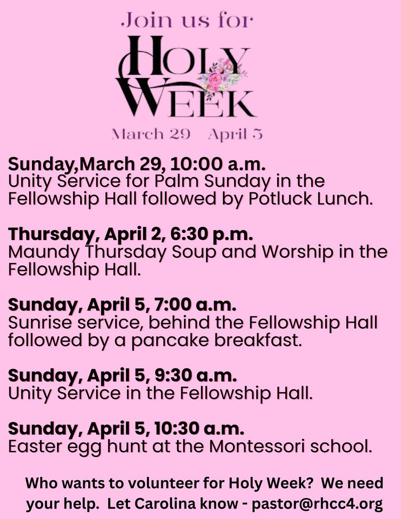 If you can't make it to worship service on Sunday, it will be live streamed to the RHCC Facebook page during the Traditional Service at 9:30am. Then the service will be available on FB anytime after. 10/26/23